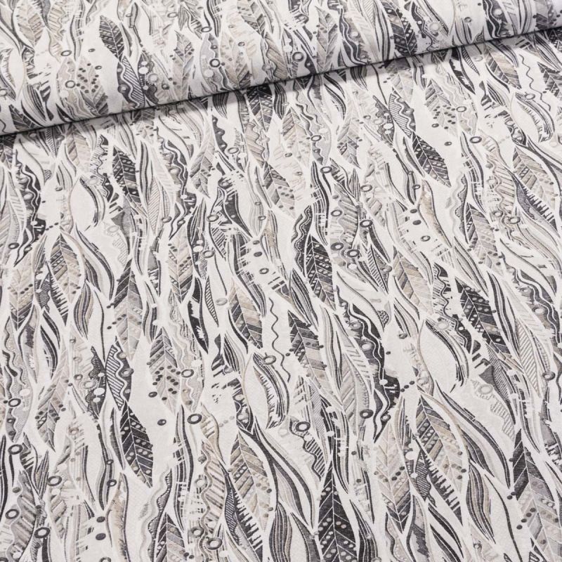 Směsová látka (tkanina) se vzorem béžovo-šedých peříček. Látka je v šířce 140 cm a je vyrobena z 55% bavlny a 45% polyesteru. Motiv na látce je pouze z jedné strany, z druhé je látka bez potisku.