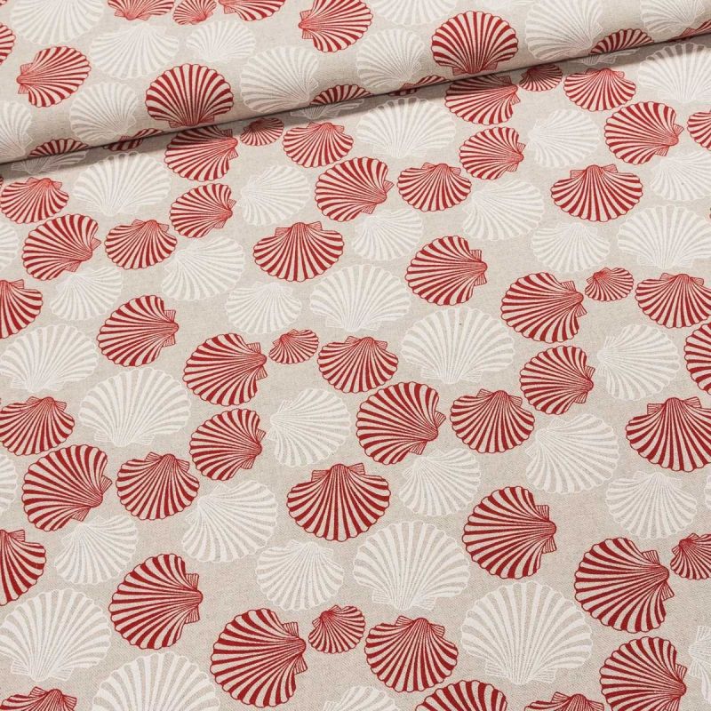 Směsová látka (tkanina) se vzorem červených a bílých mušlí na režném podkladu. Látka je v šířce 140 cm a je vyrobena ze 80% bavlny a 20% polyesteru. M...
