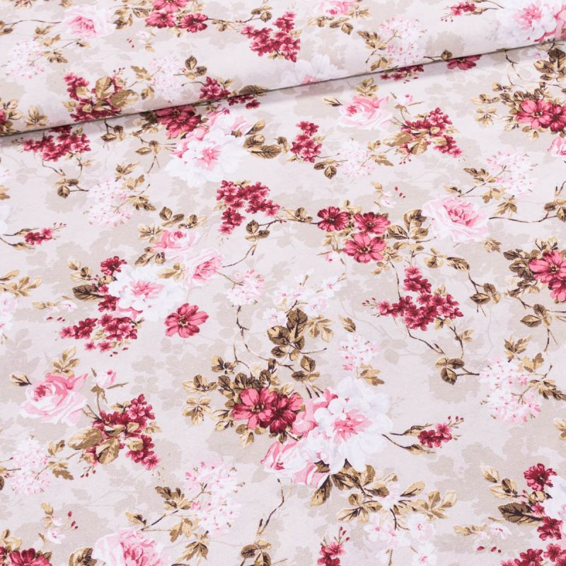 Směsová látka (tkanina) se vzorem vínových květů a růžových růží na režném podkladu. Látka je v šířce 140 cm a je vyrobena z 55% bavlny a 45% polyeste...