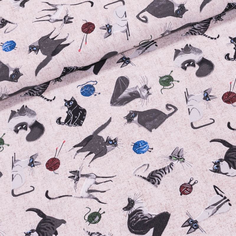 Směsové plátno TEO, kočky s klubíčky na režné, š.140cm (látka v metráži)