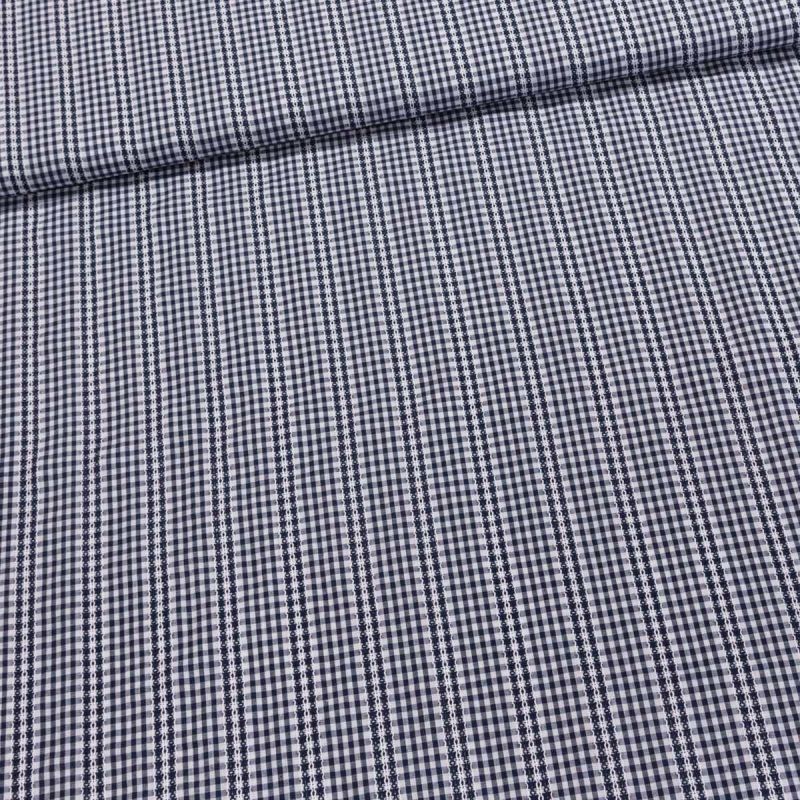 Bavlněná látka košilovina se vzorem tmavě modrých kostiček s vyšívaným vzorkem. Látka je vhodná na výrobu letních lehkých šatů, sukní, halenek, košilí. Látka je v šířce 145 cm, vyrobena ze 100% bavlny (120 g/m2). Látka má vzor z obou stran stejný.
