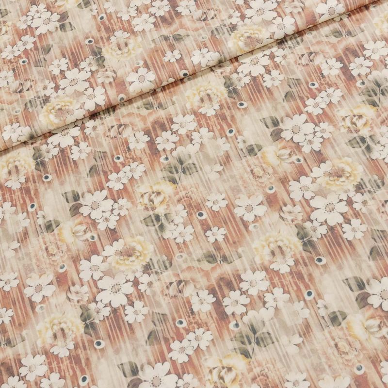 Viskózová látka (šatovka) se vzorem květů v béžových odstínech. Šatovka je v šířce 140 cm a je vyrobena ze 100% viskózy (Tencel-přírodní materiál) (gr...