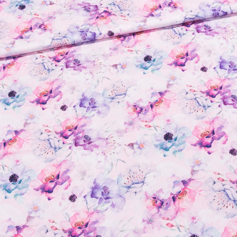 Šatovka polyesterová DT-23095 DIGITÁLNÍ TISK, růžovo-fialové květy, š.150cm (látka v metráži)