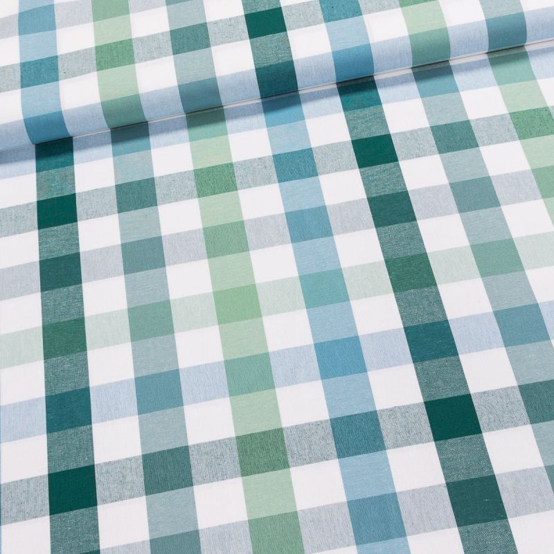 Bavlněný kanafas od českého výrobce čtverečkovaný, pestře tkaný (3,5 x 3,5 cm) v zelené barvě. Látka je v šířce 140 cm, vyrobena ze 100% bavlny (gramáž 177g/m2) v plátnové vazbě. Vzor látky je vytkávaný, a je tedy z obou stran stejný.