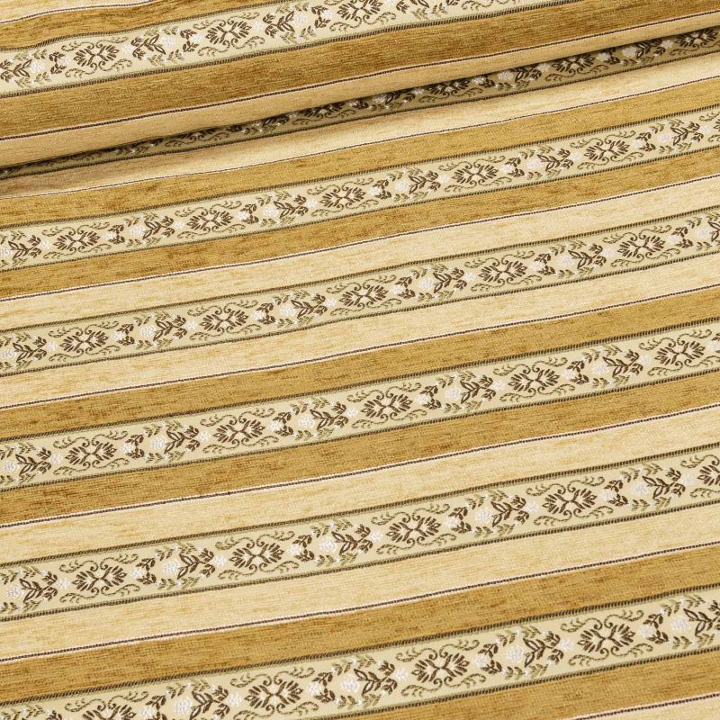 Potahová látka se zámeckým vzorem v proužcích protkávaná žinílkovým vláknem v béžových barvách. Potahovka je v šířce 140 cm a je vyrobena ze 100% poly...