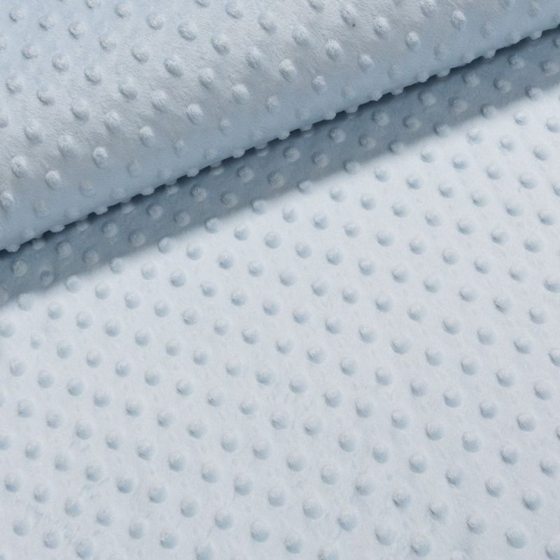 Minky fleece (mikroplyš) v jednobarevné světle modré barvě s vystouplými puntíky (čudlíky). Látka je v šířce 150 cm a je vyrobena z heboučkého 100% mikropolyesteru s chlupem a protlačovaným vzorem (vzor i chlup je jen z jedné strany).