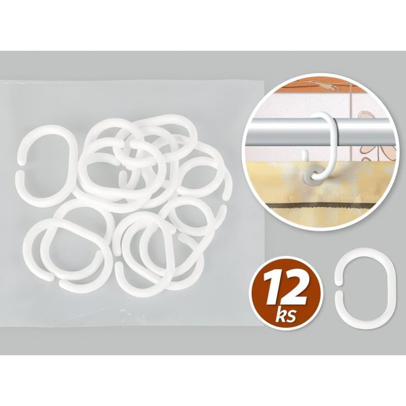 Náhradní plastové kroužky na koupelnové závěsy. Kroužky jsou vhodné pro sprchové závěsy z naší nabídky. Sada obsahuje 12 kusů.