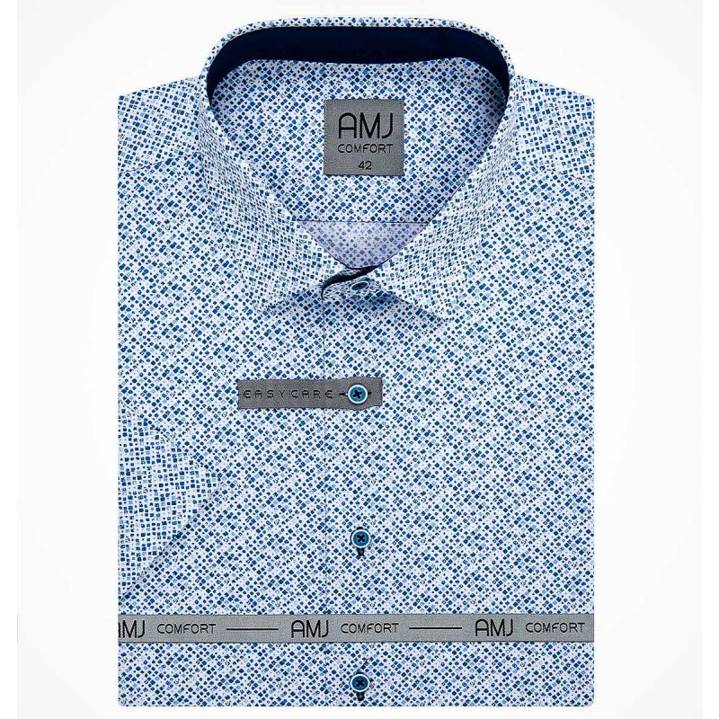 Pánská vzorovaná košile AMJ Comfort s krátkým rukávem. Pánská košile je v modro-bílé barvě se vzorem kostek vytvářejících efekt mramoru s tmavě modrými doplňky. Košile se hodí jak do zaměstnání, tak na běžné nošení i do společnosti. V této košili Vám bude velmi příjemně díky použití kvalitního materiálu (95% bavlny 5% spandex).