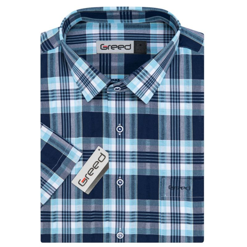 Pánská károvaná košile GREED s krátkým rukávem. Pánská košile je se vzorem modrého kára. Vhodná je košile jak do zaměstnání, tak na běžné nošení i do společnosti. Košile je vyrobena z kvalitního materiálu (100% bavlna), takže Vám bude v košili velmi příjemně.
