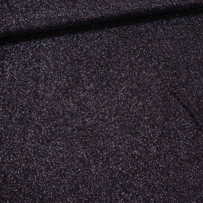 Elastický polyesterový úplet (jersey) v jednobarevné černé) barvě se stříbrnými třpytkami. Je vyroben z 95% polyester a 5% elastanu (gramáž 211g/m2). Látka je v šířce 150 cm. Úplet je díky lesklému provedení vhodný na společenské oblečení jako jsou šaty, sukně, kardigany, topy či oděvní doplňky. Látka je z rubové strany matná.