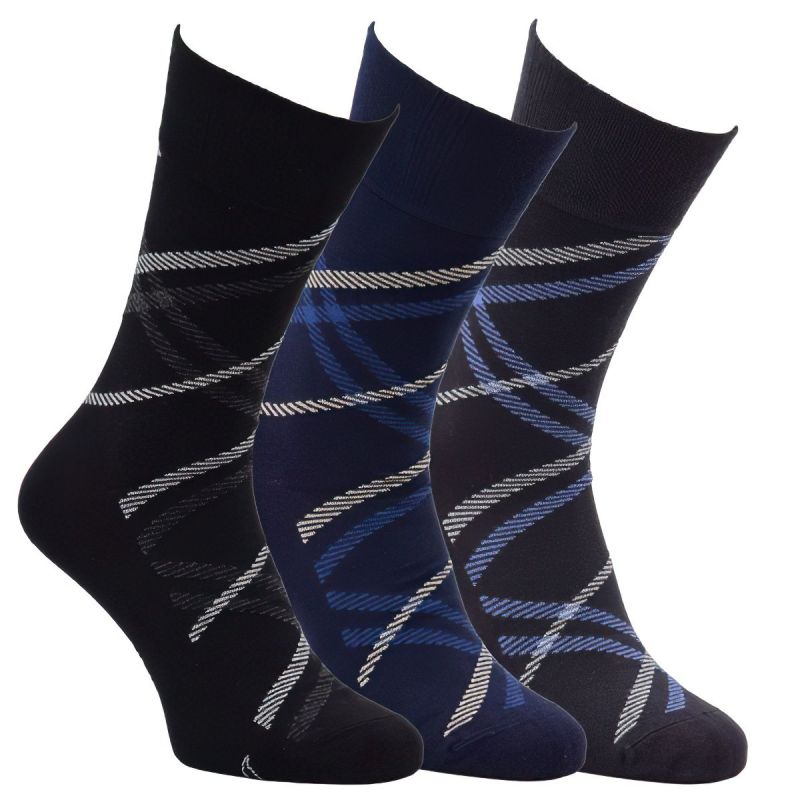 Pánské bambusové zdravotní oblekové vzorované ponožky v černé, modré a šedé barvě se vzorem kára s příjemným lemem. Pohodlí zajišťuje plochý šev na špici (ruční řetízkování) a trvanlivost ponožek pak zesílení (zdvojené pletení) v oblasti paty a špice. Klasické módní bambusové vzorované ponožky se příjemně nosí a netlačí. Elastan 3D zajišťuje skvělou elasticitu a ponožky neškrtí díky pohodlnému vaflovému lemu. Cena je uvedena za balení obsahující 3 páry ponožek.
