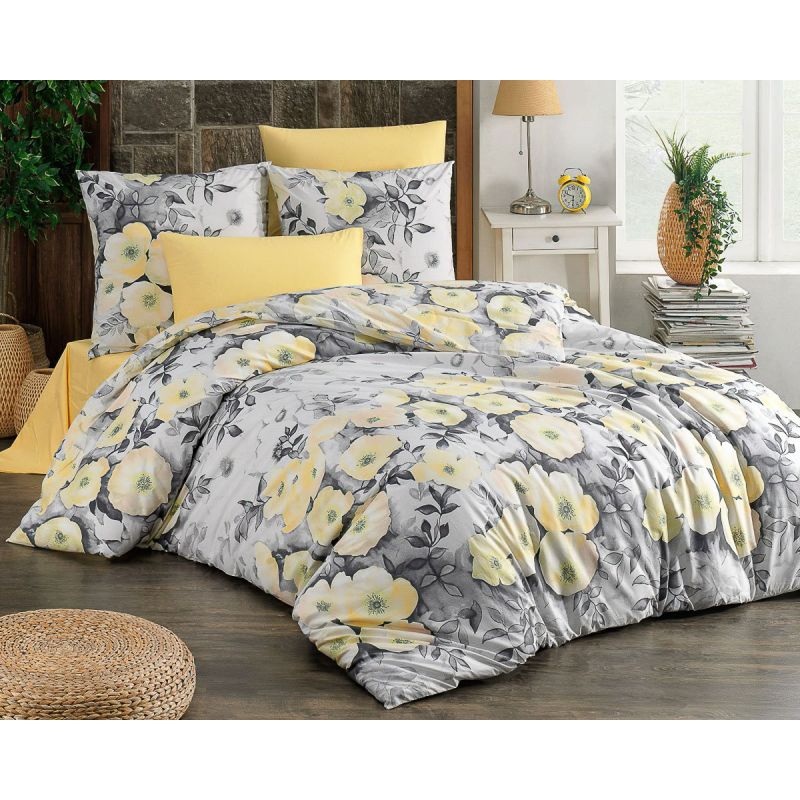 Bavlněné povlečení za dostupnou cenu se vzorem žlutých květin na šedém podkladu. Povlak na přikrývku má vzor z obou stran stejný Povlak na polštář má ...