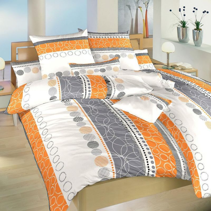Krepové povlečení se vzorem oranžových, bílých a šedých pruhů s ornamenty. Vrchní i spodní strana přikrývky je stejná. Souprava je vyrobena ze 100% česané bavlny a obsahuje jeden povlak na přikrývku 140 x 200 cm a jeden povlak na polštář 70 x 90 cm. Zapínání na zip.