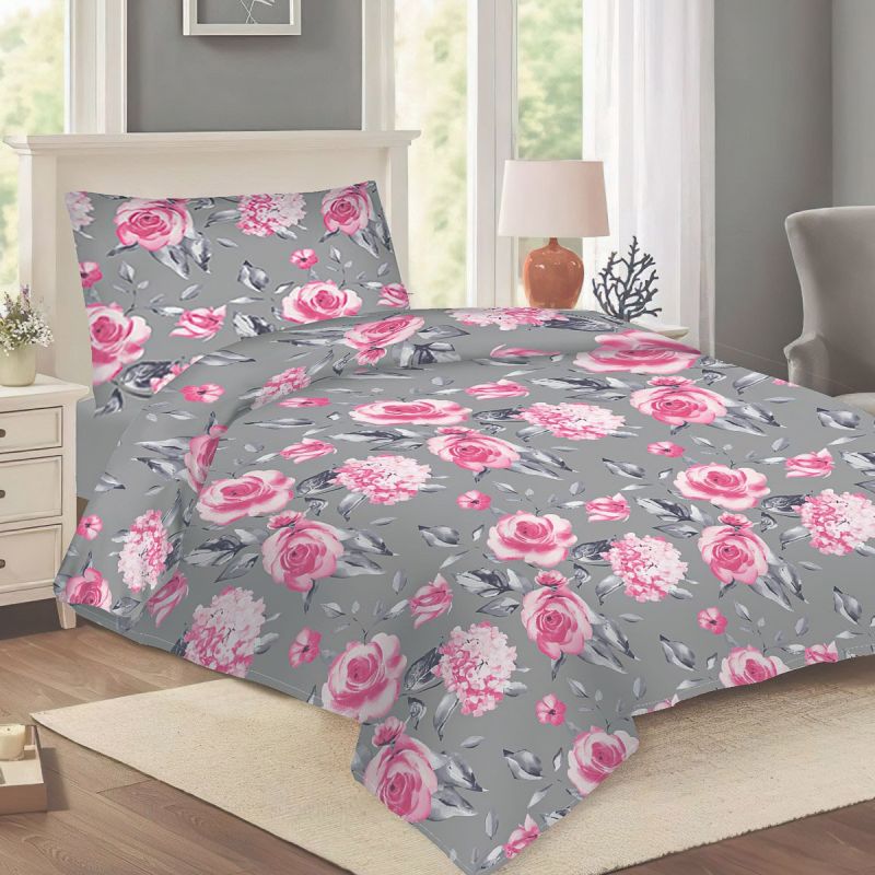 Povlečení NELA 31 DANA, růžové růže na šedé, bavlna hladká, 140x200cm + 70x90cm