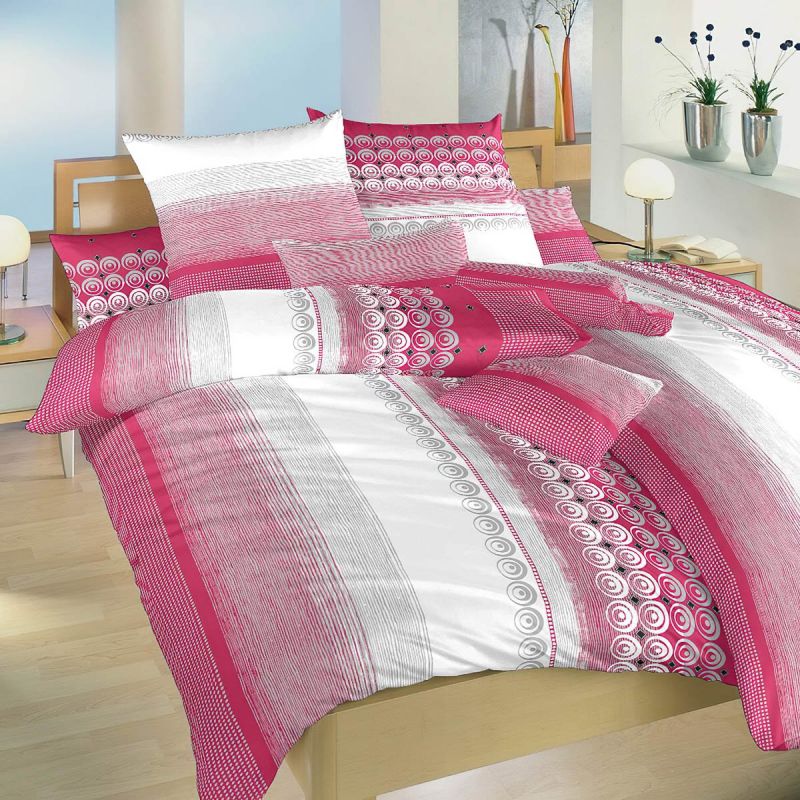 Krepové povlečení se vzorem vínových a bílých pruhů a kroužků. Vrchní i spodní strana přikrývky je stejná. Souprava je vyrobena ze 100% bavlny a obsahuje jeden povlak na přikrývku 140 x 200 cm a jeden povlak na polštář 70 x 90 cm. Zapínání na zip.
