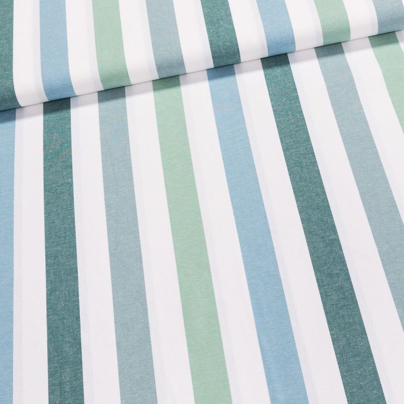 Bavlněný kanafas od českého výrobce proužkovaný, pestře tkaný (3,5 cm) v zelené barvě. Látka je v šířce 140 cm, vyrobena ze 100% bavlny (gramáž 177g/m2) v plátnové vazbě. Vzor látky je vytkávaný, a je tedy z obou stran stejný.