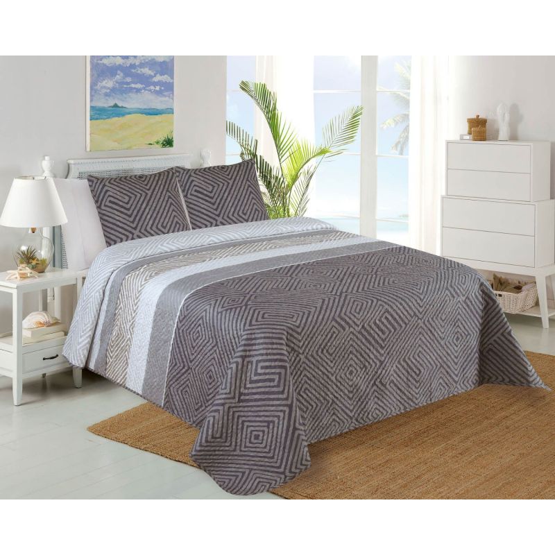 Přehoz na postel s geometrickým vzorem pruhů v šedo-hnědých barvách. Přehoz je k dispozici na jednolůžko v rozměru 140 x 220 cm a je dodáván s povlakem na polštář 45 x 45cm v hladkém provedení ze 100% polyesteru s prolisovaným vzorem jakoby proševu.