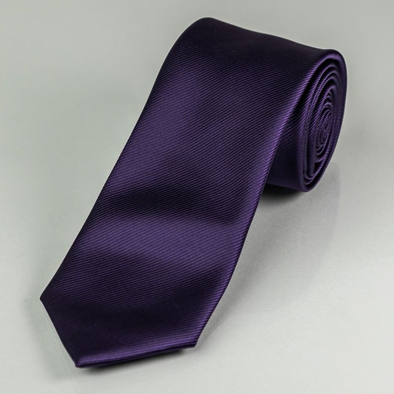 Pánská ručně šitá kravata AMJ v tmavě fialové barvě s jemným šikmým proužkem. Šířka 7,5 cm, délka 146 cm, materiál 100% polyester.