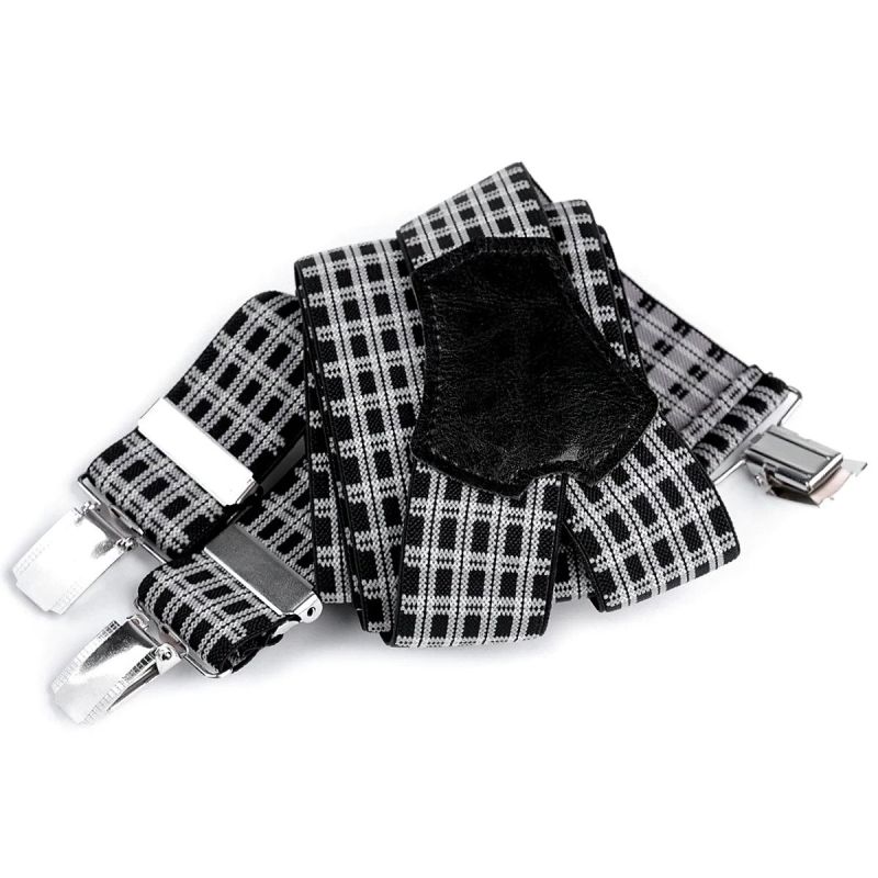 Pánské šle se vzorem drobného černo-bílého kára s nastavitelnou délkou 120 cm, šíře 3,5 cm v provedení ve tvaru písmene "Y" s uchycením na žabky a zadní vsadkou z eko-kůže.