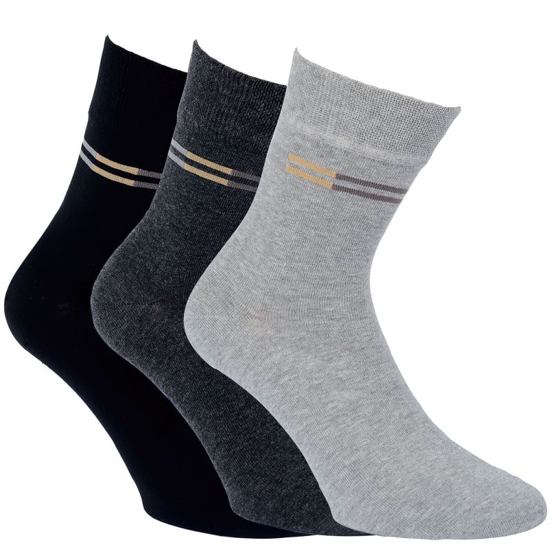 Pánské bavlněné zkrácené volnočasové ponožky v černé, šedé a světle šedé barvě s jemným svěrem lemu. Pohodlí zajišťuje plochý šev na špici (ruční řetízkování) a trvanlivost ponožek pak zesílení (zdvojené pletení) v oblasti paty a špice. Dobře drží díky své elasticitě a neškrtí díky pohodlnému vaflovému lemu. RS klasické vzorované bavlněné ponožky (75% bavlna, 22% polyamid, 3% elastan) se jednoduše navlékají a skvěle nosí. Vysoký obsah bavlny, jemné 200 jehlové pletení. Cena je uvedena za balení obsahující 3 páry ponožek.