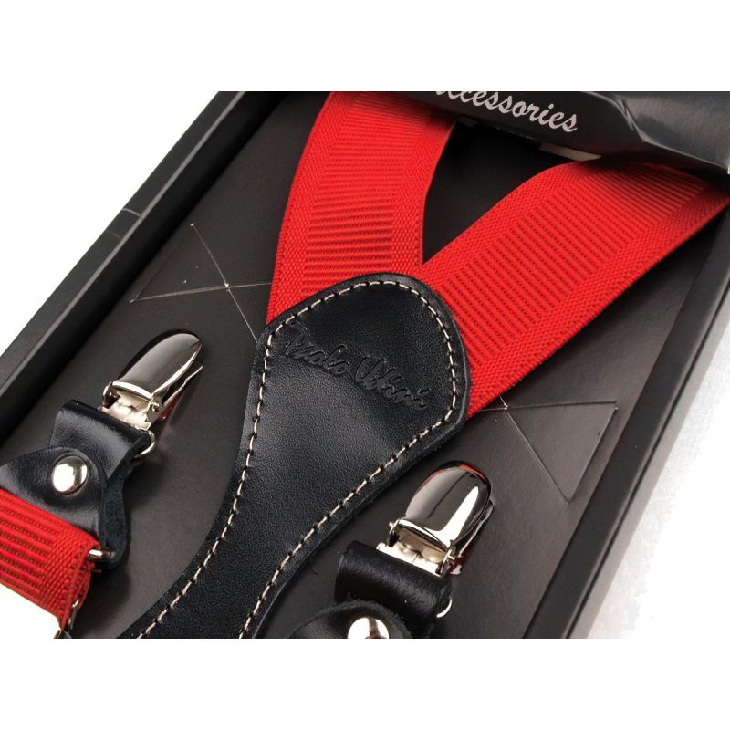 Pánské šle (kšandy) červené s koženými prvky s nastavitelnou délkou až 110 cm, šíře 3,5cm v provedení ve tvaru písmene "Y" s uchycením na žabky.
