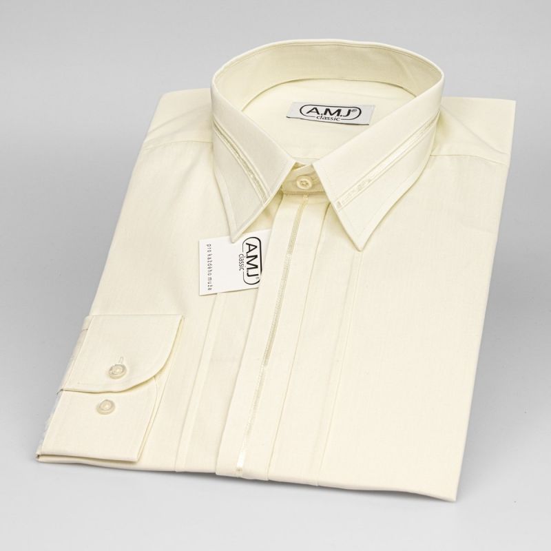 Pánská svatební košile AMJ Classic s dlouhým rukávem se saténovým límečkem a skrytými knoflíky s ozdobnými prvky ve smetanové barvě.