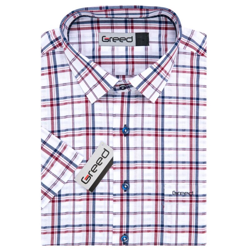 Pánská károvaná košile GREED s krátkým rukávem. Pánská košile je se vzorem červeno-modro-bílého kára. Vhodná je košile jak do zaměstnání, tak na běžné nošení i do společnosti. Košile je vyrobena z kvalitního materiálu (100% bavlna), takže Vám bude v košili velmi příjemně.