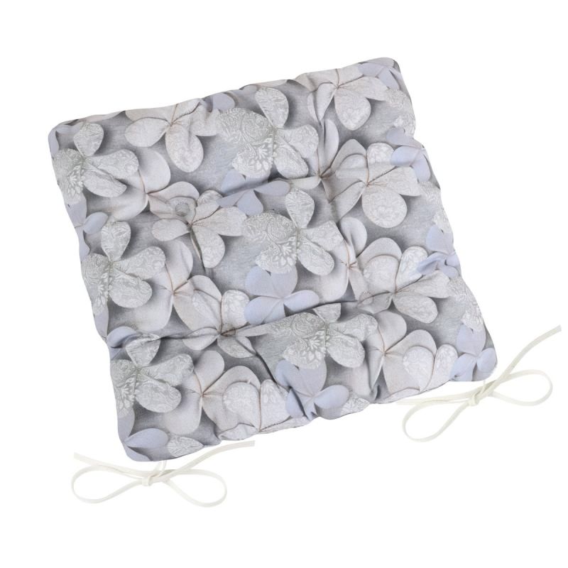 Prošívaný čtvercový sedák s motivem šedých květů v rozměru 40x40cm s výškou cca 8 cm. Sedák je vyroben z kvalitního materiálu s vysokou odolností proti prosezení a je opatřen provázky pro pevné přichycení k židli. Je vhodný jako dekorační prvek do kuchyně nebo na zahradu pro příjemné sezení. Povlak podsedáku je vyrobený z kombinace 90 % bavlny a 10 % polyesteru, výplň je tvořena ze 100% polyuretanu (rouno z dutého vlákna).