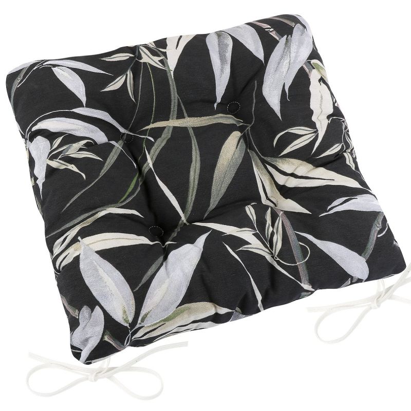 Prošívaný čtvercový sedák s motivem bambusových listů na černém podkladu v rozměru 40x40cm s výškou cca 8 cm. Sedák je vyroben z kvalitního materiálu s vysokou odolností proti prosezení a je opatřen provázky pro pevné přichycení k židli. Je vhodný jako dekorační prvek do kuchyně nebo na zahradu pro příjemné sezení. Povlak podsedáku je vyrobený z kombinace 70 % bavlny a 30 % polyesteru, výplň je tvořena ze 100% polyuretanu (rouno z dutého vlákna).
