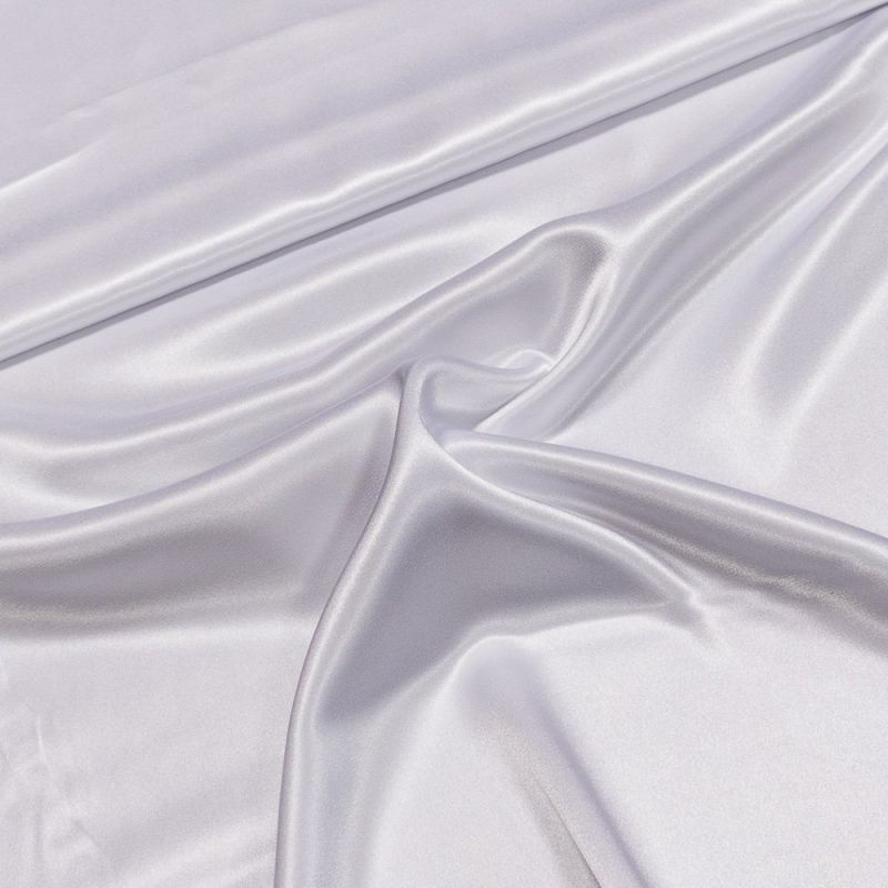 Elastický polyesterový satén v jednobarevné lesklé bílé barvě. Látka je v šířce 150 cm, vyrobena z 97% polyesteru a 3% elastanu. Látka je z jednéstrany lesklá, z druhé strany je matná.