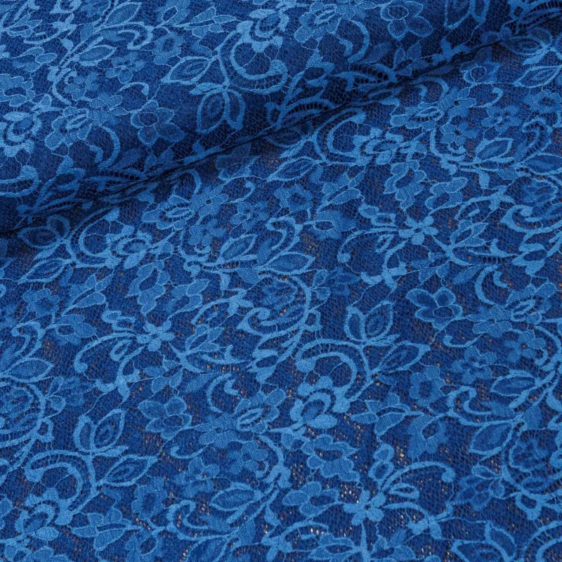 Látka, elastická krajka v modré barvě. Krajka je v šířce 150 cm a je vyrobena z 90% nylonu a 10% elastanu. Látka je vhodná na plesové a společenské halenky, topy, šaty a sukně.