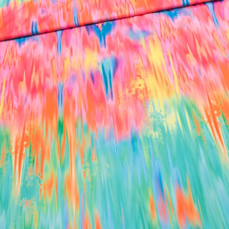Polyesterová látka (šatovka) s duhovým vzorem v růžových, modrých, žlutých a zelených barvách. Přechody po délce se opakují zhruba po 40-50 cm. Šatovka je v šířce 145 cm a je vyrobena ze 100% polyesteru (gramáž 140g/m2). Látka je vhodná na letní kostýmky, tuniky, halenky, topy, šaty, sukně či kalhoty. Látka má vzor z jedné strany, z druhé strany je bez potisku.