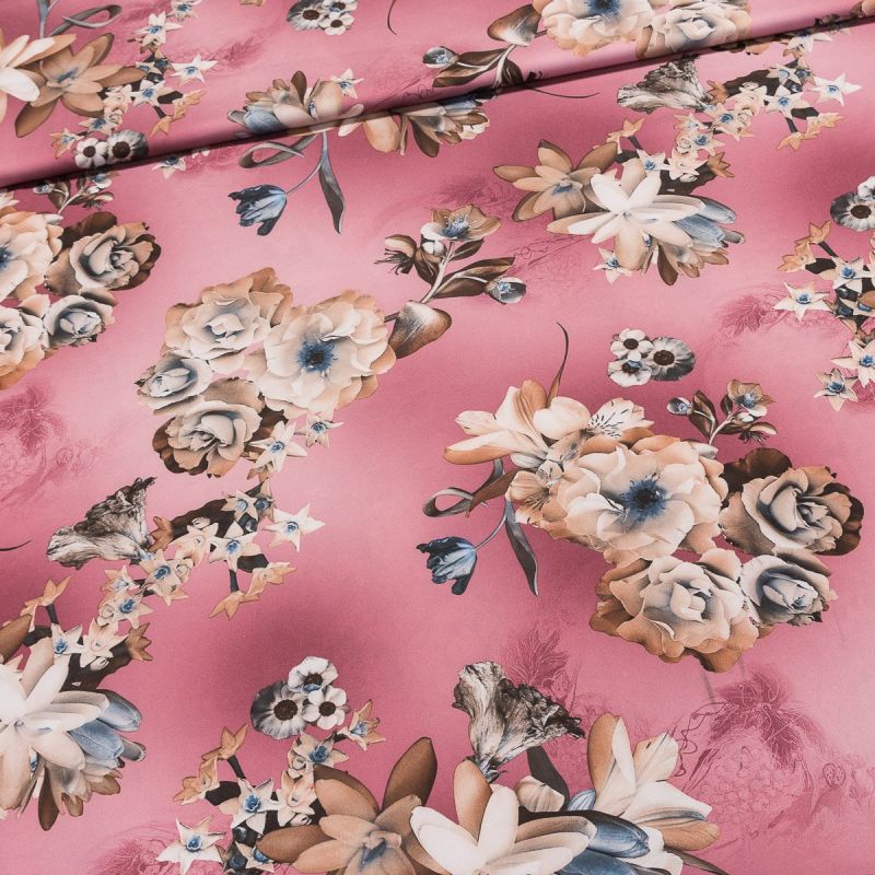 Polyesterová látka (umělé hedvábí) s motivem běžovo-modrých růží na růžovém podkladu. Hedvábí je v šířce 140 cm a je vyrobena ze 100% polyesteru (gramáž 140g/m2). Látka je vhodná na letní kostýmky, tuniky, halenky, topy, šaty, sukně či kalhoty. Látka má vzor z jedné strany, z druhé strany je bez potisku.