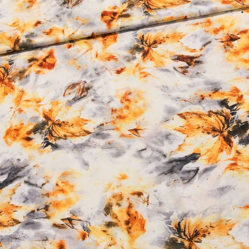 Polyesterová látka (umělé hedvábí) se vzorem rozpitých oranžových podzimních listů. Hedvábí je v šířce 140 cm a je vyroben z 100% polyesteru (gramáž 120g/m2). Látka je vhodná na letní kostýmky, tuniky, halenky, topy, společenské šaty, sukně či kalhoty. Látka má vzor z jedné strany, z druhé strany je bez potisku.