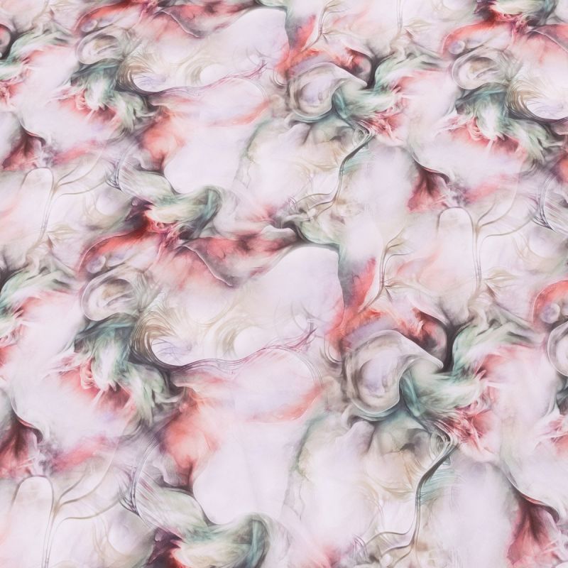 Polyesterová látka (umělé hedvábí) se vzorem připomínající květny v růžovo-béžových barvách. Hedvábí je v šířce 140 cm a je vyroben z 100% polyesteru (gramáž 100g/m2). Látka je velmi lehká a je vhodná na letní kostýmky, tuniky, halenky, topy, společenské šaty, sukně či kalhoty. Látka má vzor z jedné strany, z druhé strany je bez potisku.