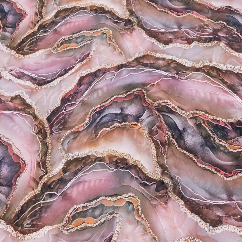 Polyesterová látka (umělé hedvábí) se vzorem připomínající nerosty ve starorůžovo-béžových barvách. Hedvábí je v šířce 140 cm a je vyroben z 100% polyesteru (gramáž 100g/m2). Látka je velmi lehká a je vhodná na letní kostýmky, tuniky, halenky, topy, společenské šaty, sukně či kalhoty. Látka má vzor z jedné strany, z druhé strany je bez potisku.