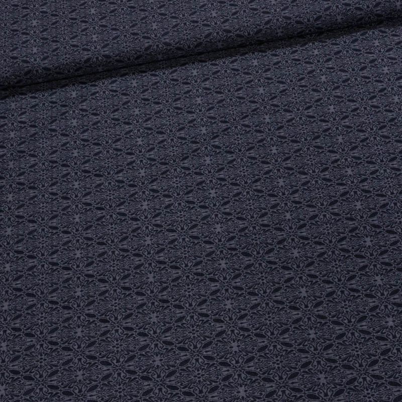 Směsová látka (šatovka) s motivem černých květinových ornamentů na tmavě modrém podkladu. Šatovka je v šířce 140 cm a je vyrobena ze 46% polyesteru, 29% polyamidu, 20% viskózy a 5% elastanu (gramáž 200g/m2). Látka je vhodná na kostýmky, tuniky, halenky, topy, šaty, sukně či kalhoty. Látka má vzor pozitiv / negativ.