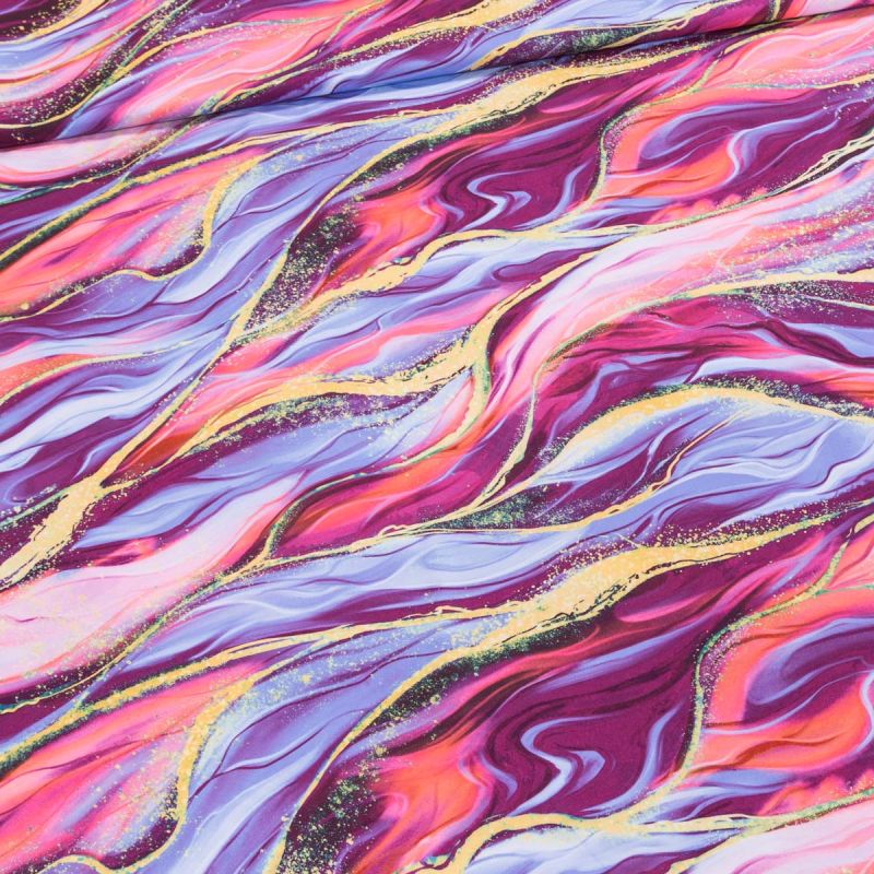 Směsová látka (umělé hedvábí) se vzorem vln v růžových a žlutých barvách. Hedvábí je v šířce 150 cm a je vyrobeno z 90% polyesteru, 6% viskózy a 4% el...