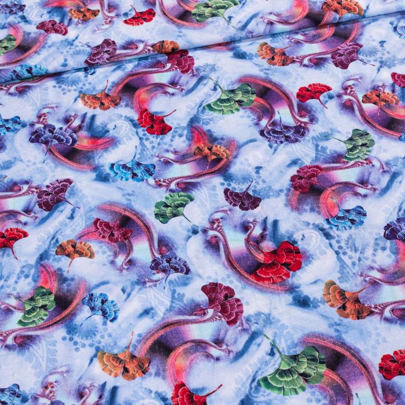 Viskózová látka (šatovka) se vzorem různobarevných listů ginka na modrém pozadí. Šatovka je v šířce 140 cm a je vyrobena ze 100% viskózy (gramáž 120g...