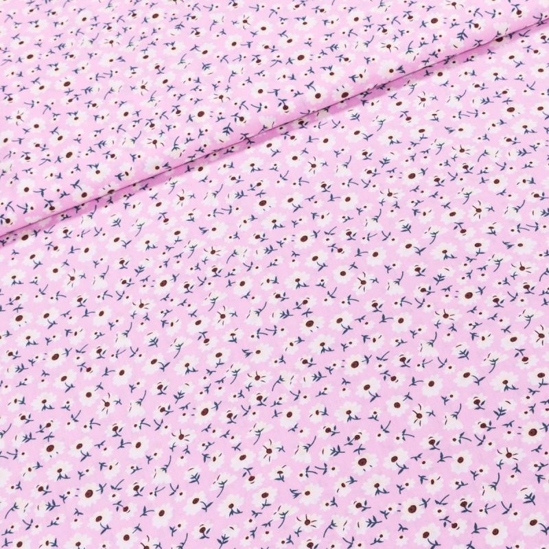 Viskózová látka (šatovka) se vzorem krémových květinek na růžovém pozadí. Šatovka je v šířce 145 cm a je vyrobena ze 100% viskózy (gramáž 120g/m2). L...