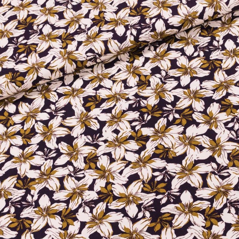 Viskózová látka (šatovka) se vzorem béžových květů na temně fialovém pozadí. Šatovka je v šířce 140 cm a je vyrobena z 98% viskózy a 2% elastanu (gram...