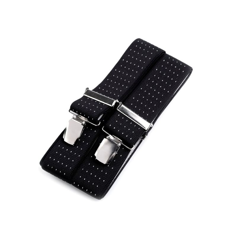 Pánské šle jednobarevné v černé barvě s bílými puntíky s nastavitelnou délkou 125 cm, šíře 3,5 cm v provedení ve tvaru písmene "X" s uchycením na žabky.