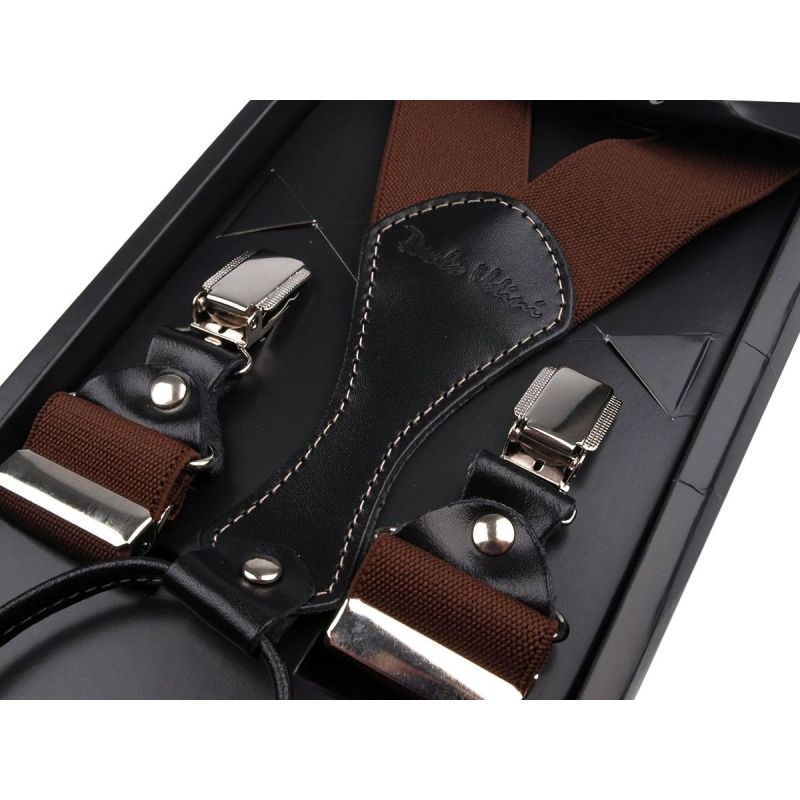 Pánské šle (kšandy) v tmavě hnědé barvě s nastavitelnou délkou až 110 cm, šíře 3,5cm v provedení ve tvaru písmene "Y" s uchycením na žabky.