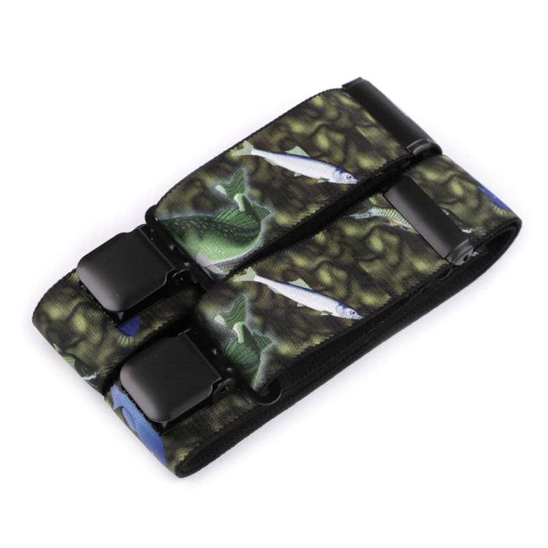 Pánské šle s rybářským vzorem ryb a štik v khaki zelené maskáčové barvě jsou určeny pro všechny rybáře a příznivce rybářství nebo jako stylový dárek. Šle jsou s nastavitelnou délkou 120 cm, šíře 4 cm v provedení ve tvaru písmene "Y" s uchycením na žabky.