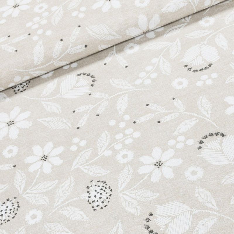 Směsové plátno ADA BÉŽOVÁ, bílé květiny, š.140cm (látka v metráži)