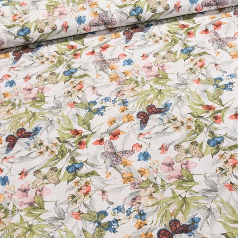 Směsová látka (tkanina) se vzorem květin s barevnými motýli. Látka je v šířce 140 cm a je vyrobena z 55% bavlny a 45% polyesteru. Motiv na látce je pouze z jedné strany, z druhé je látka bez potisku.