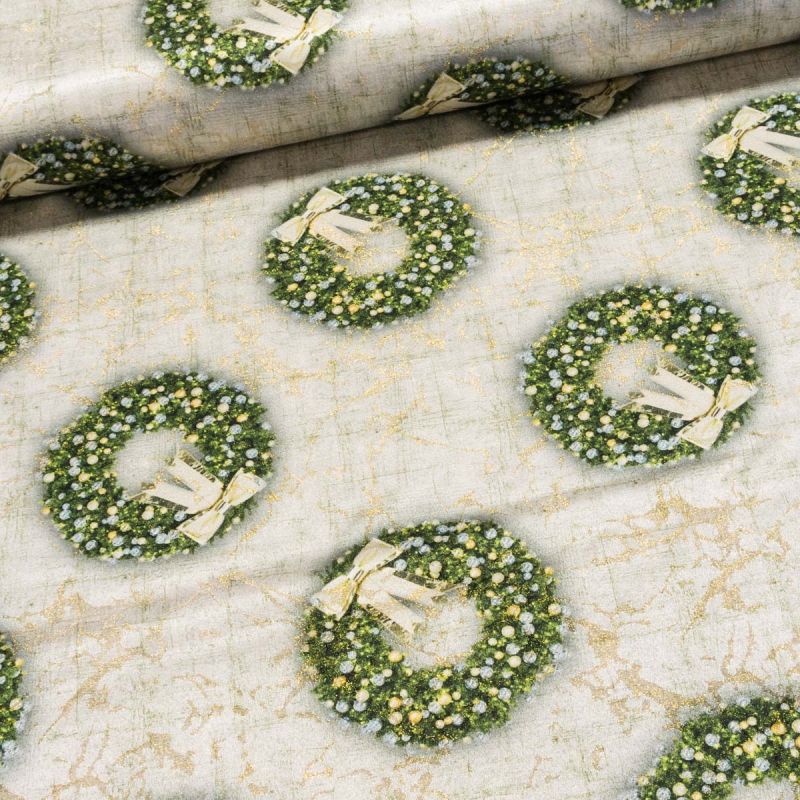 Směsová vánoční látka (tkanina) s motivem zelených zdobených věnečků protkávaných zlatým lurexem na béžovém podkladu. Látka je v šířce 150 cm v plátnové vazbě (180 g/m2) a je vyrobena z 98% polyesteru a 2% lurexu. Motiv na látce je jen z jedné strany z druhé strany je bez potisku. Látka je vhodná na ubrusy, prostírání, dekorační polštářky a další doplňky.