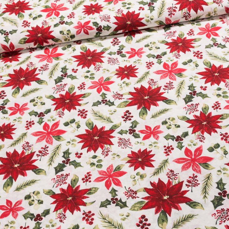 Směsová vánoční látka (tkanina) s motivem červené vánoční růže a větviček mahonky na bílém podkladu. Látka je v šířce 140 cm v plátnové vazbě (200 g/m2) a je vyrobena z 55% bavlny a 45% polyesteru. Motiv na látce je jen z jedné strany z druhé strany je bez potisku.