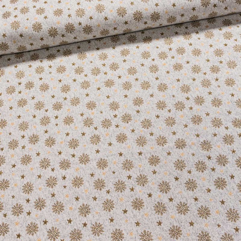 Směsová vánoční látka (tkanina) s motivem zlatých vloček na šedém podkladu protkávaném lurexem. Látka je v šířce 160 cm v hrubě tkané vazbě (220 g/m2)...