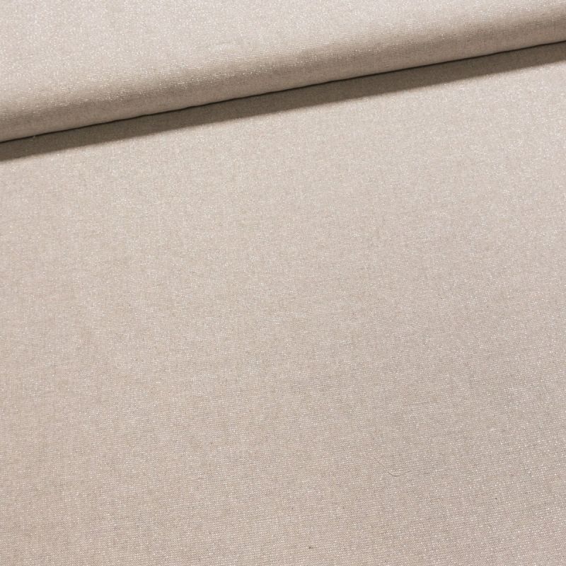 Směsová vánoční látka (tkanina) v jednobarevné režné barvě protkávaném lurexem. Látka je v šířce 140 cm v hrubě tkané vazbě (220 g/m2) a je vyrobena z 80% bavlny a 20% polyesteru s lurexu. Látka je oboustranná.